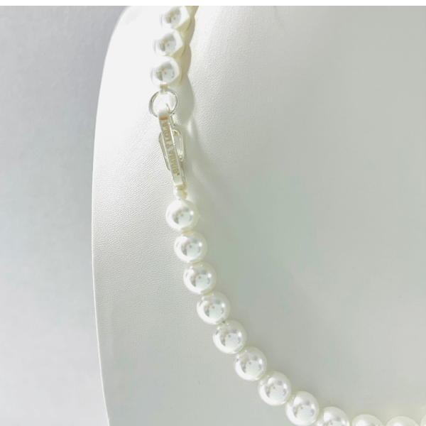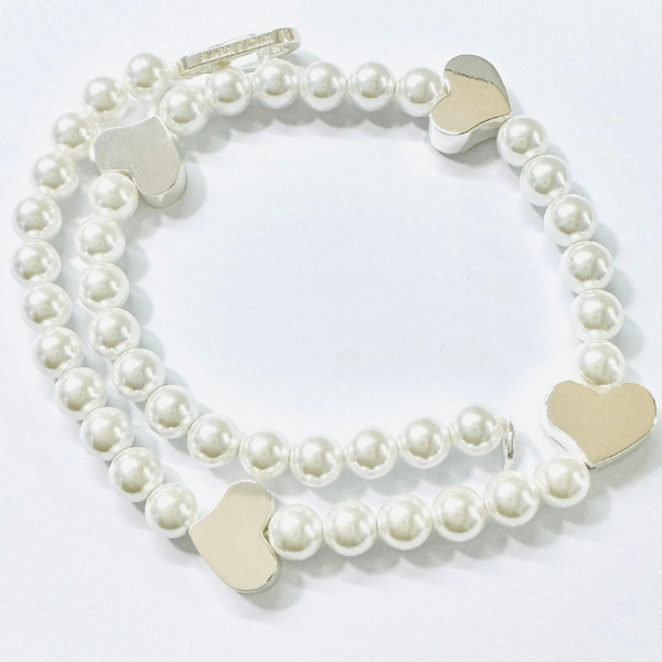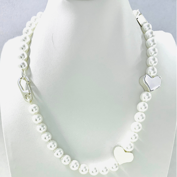 Plateado, aplique de perla artificial, motivo de corazón, logo grabado y cierre con broche langosta.