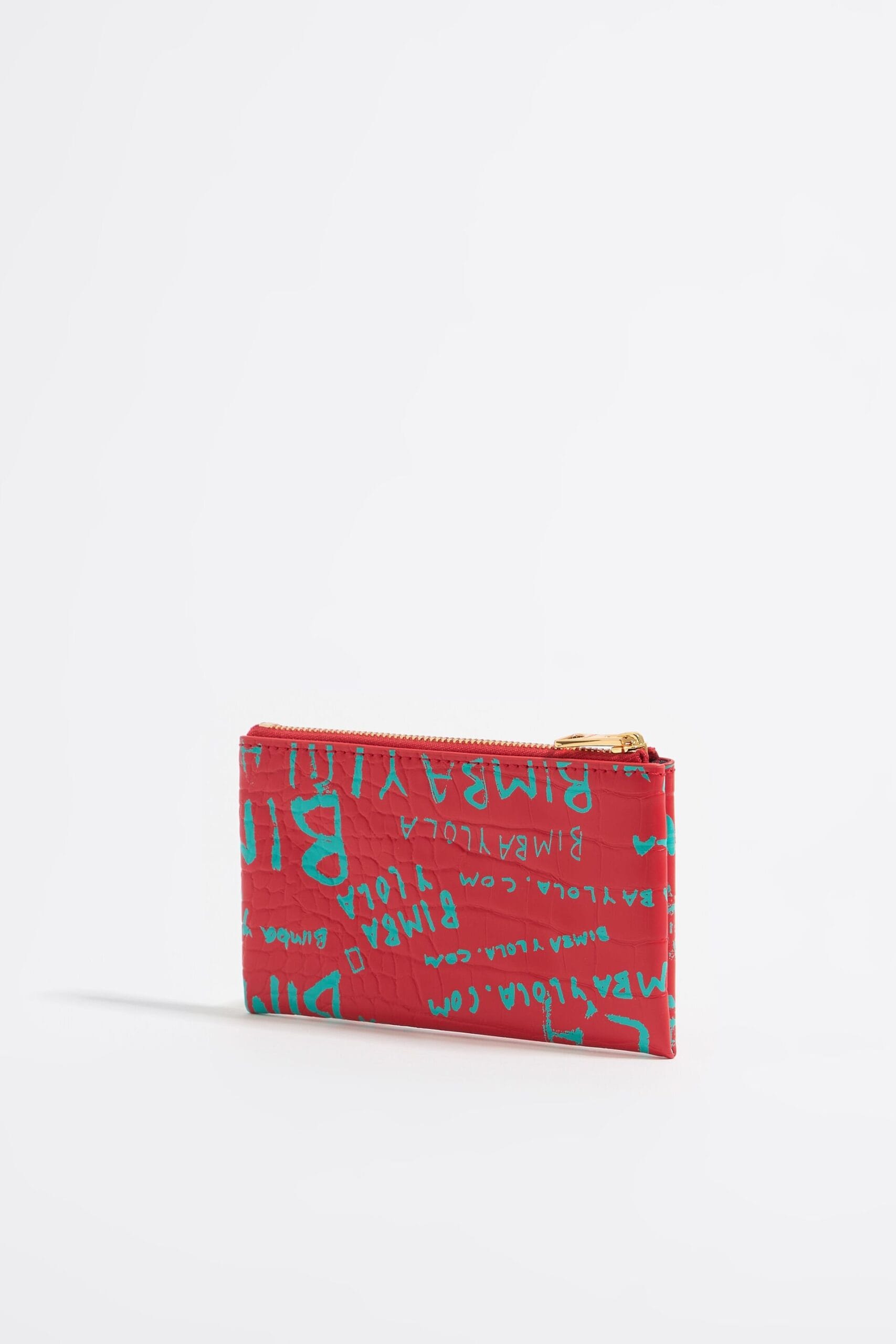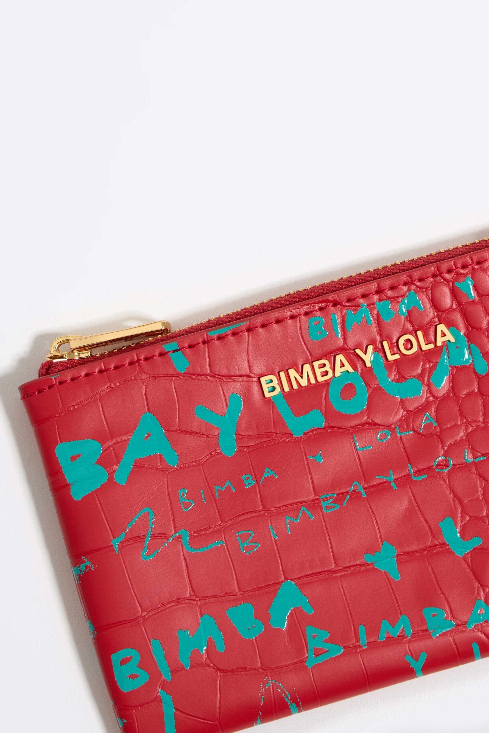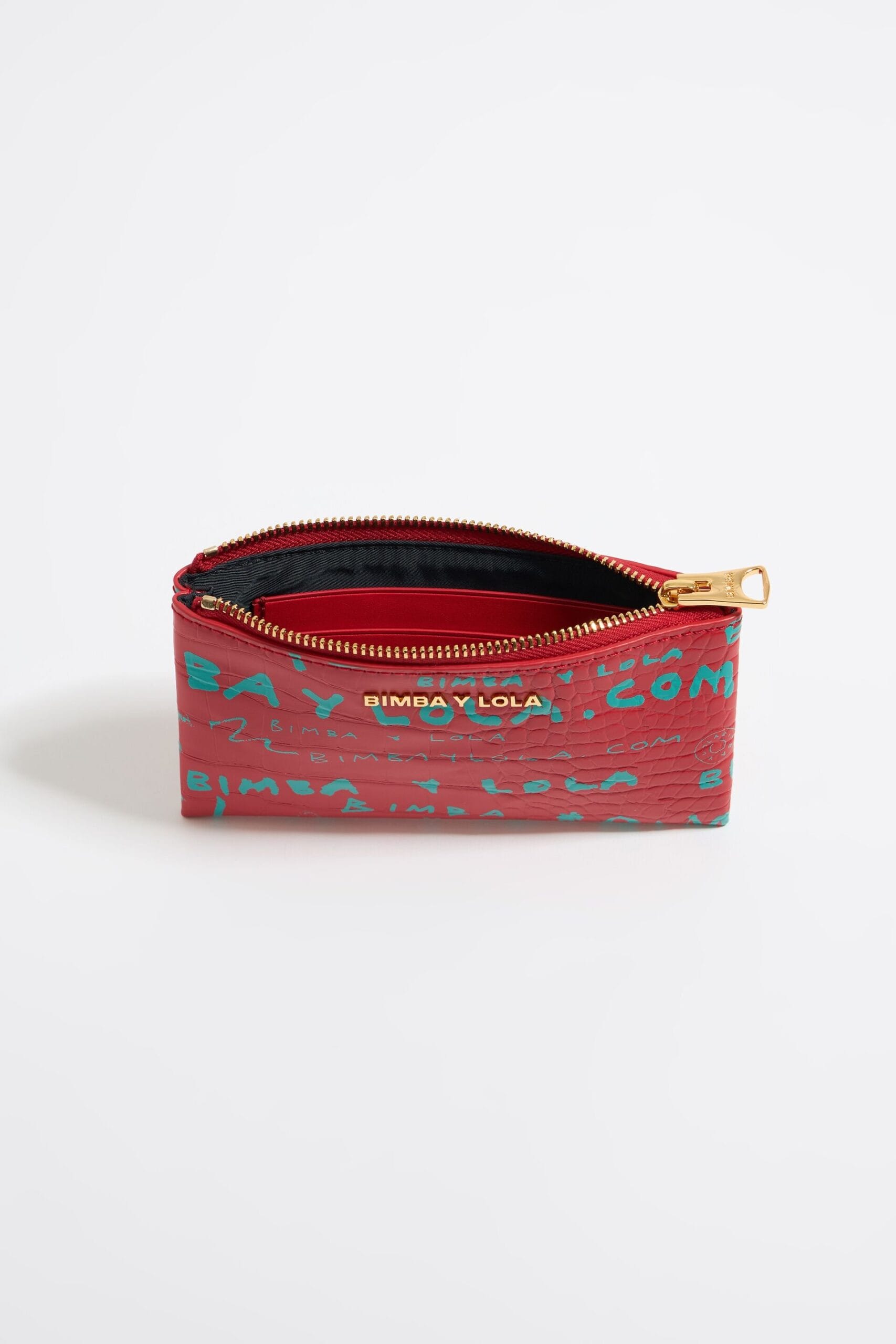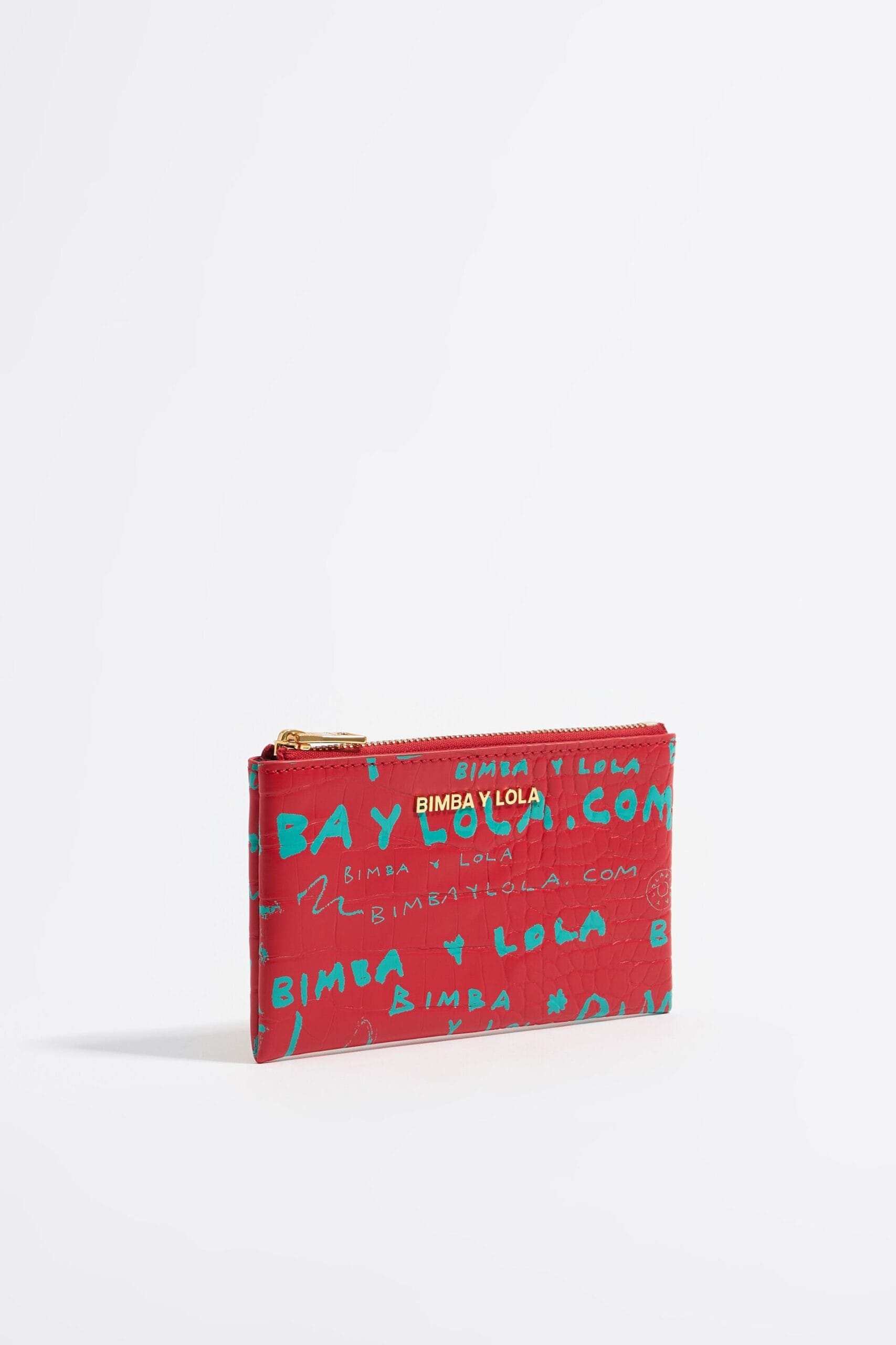 Monedero efecto cocodrilo con estampado BIMBAYLOLA.COM verde sobre fondo rojo. Modelo con cierre de cremallera y bolsillo interior. Exterior personalizado con logo metálico. Exterior: 58 % poliéster / 42 % poliuretano Forro: 90 % poliéster / 10 % poliuretano